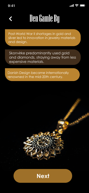 This project focused on creating a digital experience for Den Gamle By, an open-air museum in Aarhus, Denmark. We chose the Jewellery Box exhibition, home to a world-class collection of Danish jewellery spanning 100 years. Despite its cultural significance, the Jewellery Box lacked interactivity and attracted fewer visitors compared to other exhibits. Our goal was to design an engaging app to make the exhibition more appealing and fun for visitors.